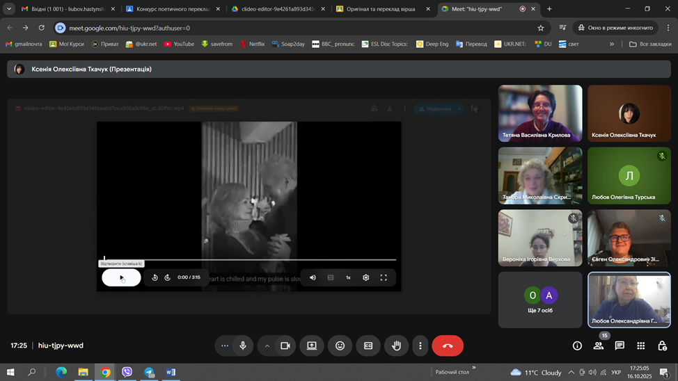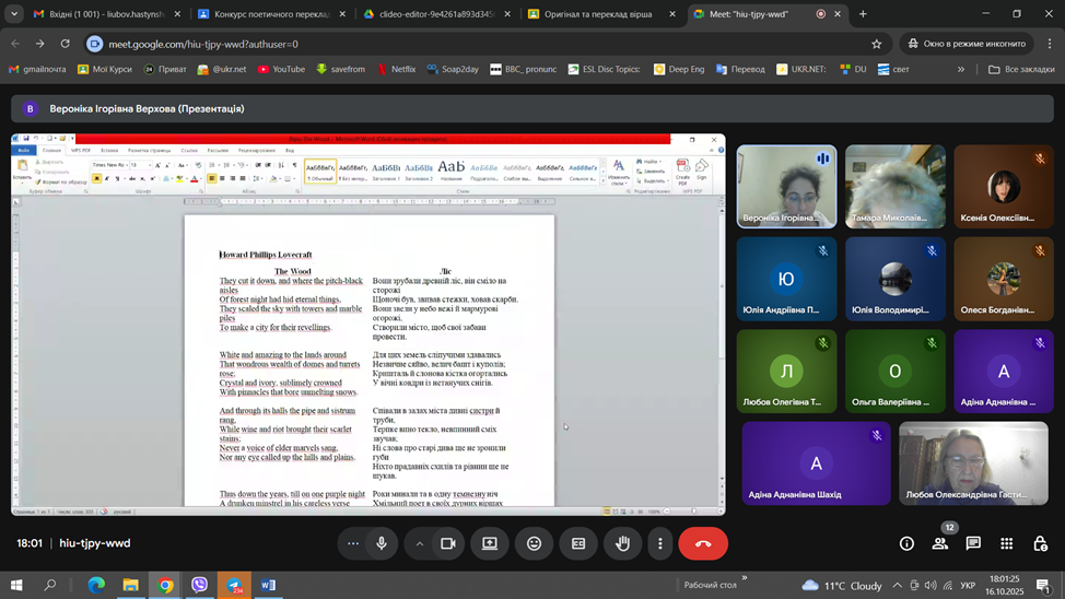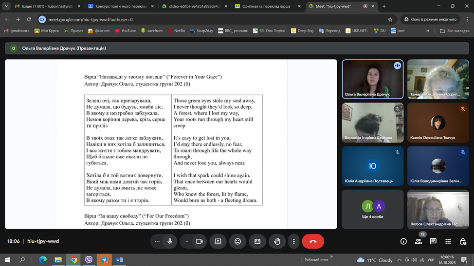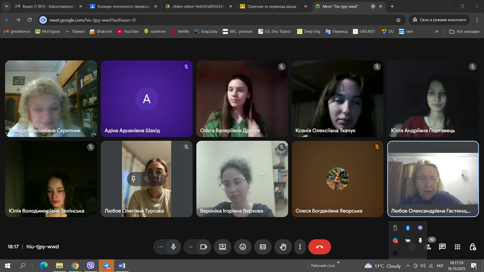 16 жовтня 2025 р. відбувся конкурс поетичного перекладу в рамках тижня англійської мови та перекладу, що традиційно проводиться кафедрою англійської філології і перекладу у жовтні. Модератором конкурсу була доцент Тетяна Василівна Крилова, у журі працювали старший викладач Любов Олександрівна Гастинщикова і доцент Тамара Миколаївна Скрипник. В конкурсі взяли участь 14 студентів з 1 по 5 курси спеціальності «Філологія».