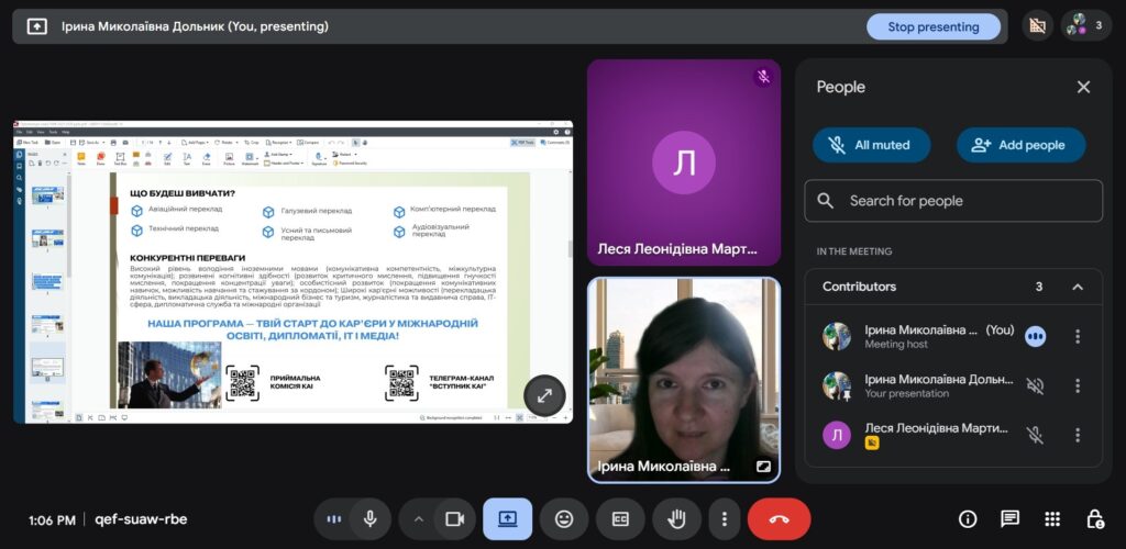 6 лютого 2026 року старший викладач кафедри англійської філології і перекладу Гуманітарно-мистецького факультету Дольник Ірина Миколаївна провела профорієнтаційні зустрічі з учнями чотирьох 11-х класів ліцею №190 м. Києва. Захід відбувався у змішаному форматі.
