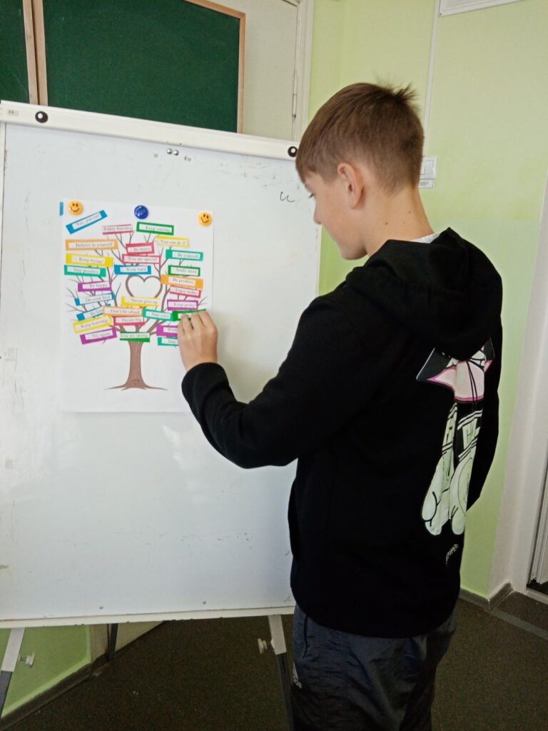 Окремим етапом заходу стало створення “Дерева натхнення” – творчого інтерактивного завдання, в межах якого учні писали англійською мовою мотиваційні фрази та цитати, які їх надихають, і прикріплювали їх на символічне дерево. Цей момент став кульмінацією заходу: учні проявили креативність, підтримували один одного, а також з цікавістю читали мотиваційні послання своїх однолітків.