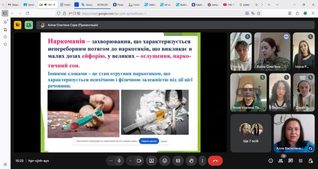17 вересня 2025 року магістрантка Сєра Аліна Олегівна в рамках проходження переддипломної практики провела для студентів виховний захід у формі лекції-бесіди з елементами дискусії на тему «Наркотичні речовини: шкода, вплив на здоров’я та майбутнє особистості й нації».