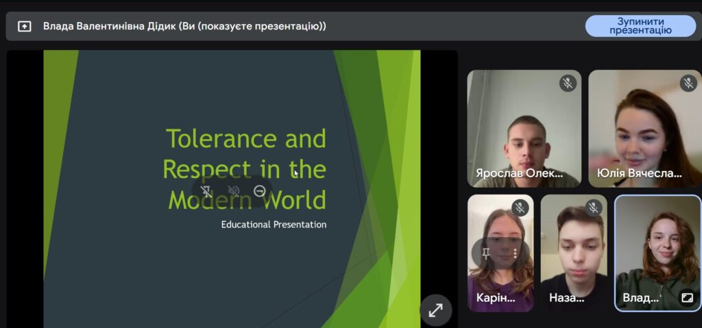 24 вересня 2025 року магістрантка кафедри англійської філології і перекладу Дідик Влада провела для студентів першого курсу виховний захід на тему “Tolerance and Respect in the Modern World”. Під час зустрічі студенти дізналися про те, що таке толерантність, які існують її основні прояви та чому вона є необхідною умовою мирного співіснування людей із різними поглядами, культурами та традиціями.